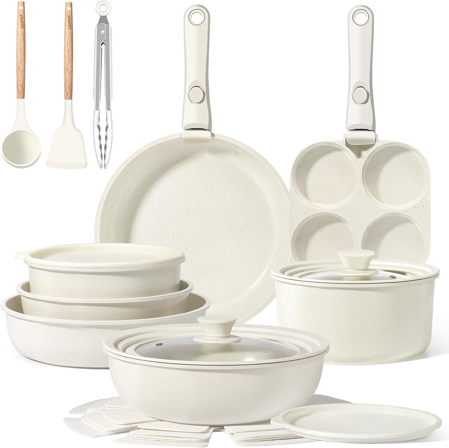 GiPP Ceramic Pots and Pans Set Non Stick, Nonstick Detachable Handle Cookware Sets, Healthy Non Toxic PFAS PFOA & PTFE Free, Dishwasher &Oven Safe, Induction Kitchen Pot and Pan, 21 Piece Cream