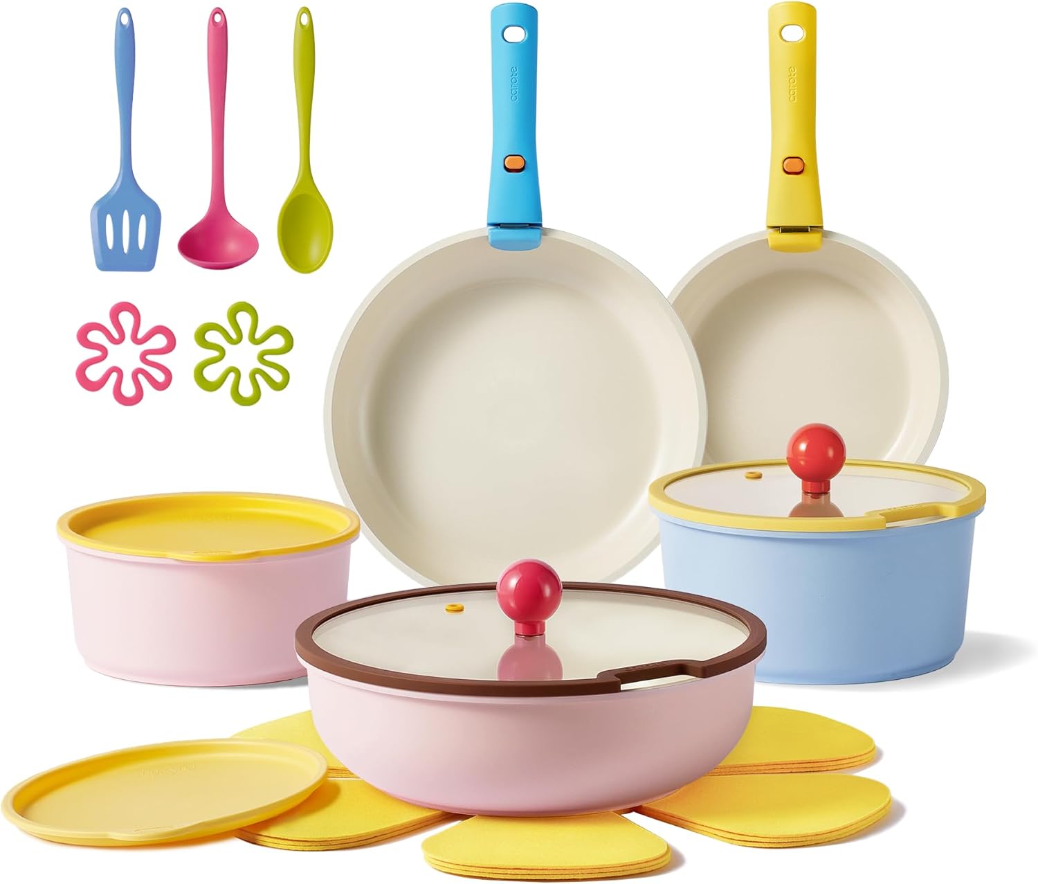 23Pcs Ceramic Cookware Set Non Stick Pots and Pans Set Non Toxic with Detachable Handle Induction Kitchen Cookware Set Space Saving, Oven & Dishwasher Safe, Cream White