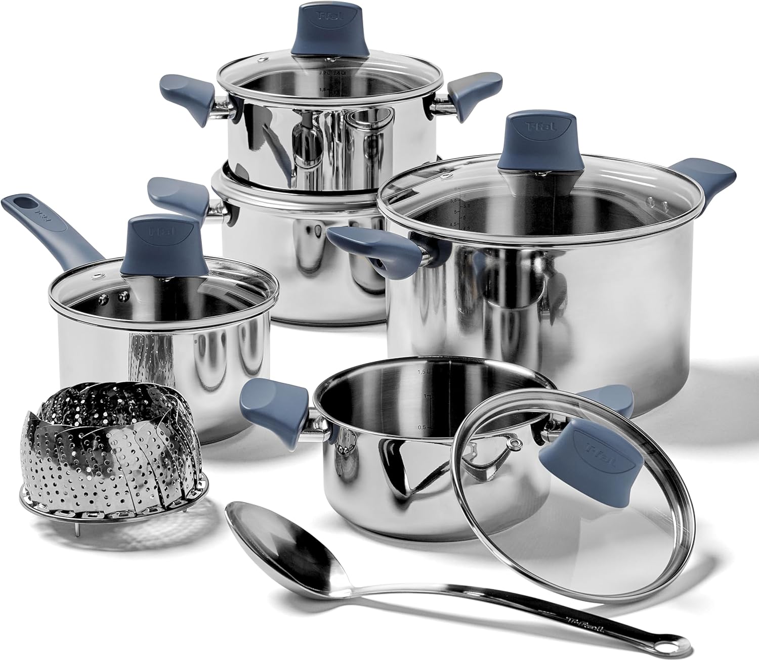 T-fal Essentials Stainless Steel Cookware Set 12 Piece, Induction Compatible, Oven Safe 350F, Cooking Set w/Stewpots, Stockpot, Saucepan, Lids & Tools, Measuring Marks, Dishwasher Safe, Silver/Blue