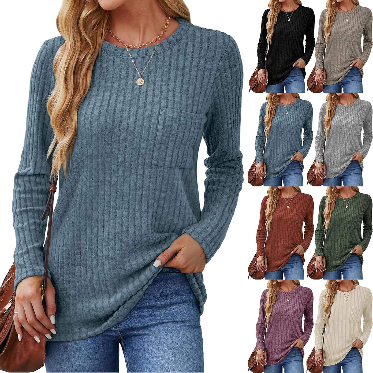 Long Sleeve Shirts for Women Casual Ribbed Knit Tunic Tops with Pocket Lightweight Crew Neck Sweatshirt Sweater