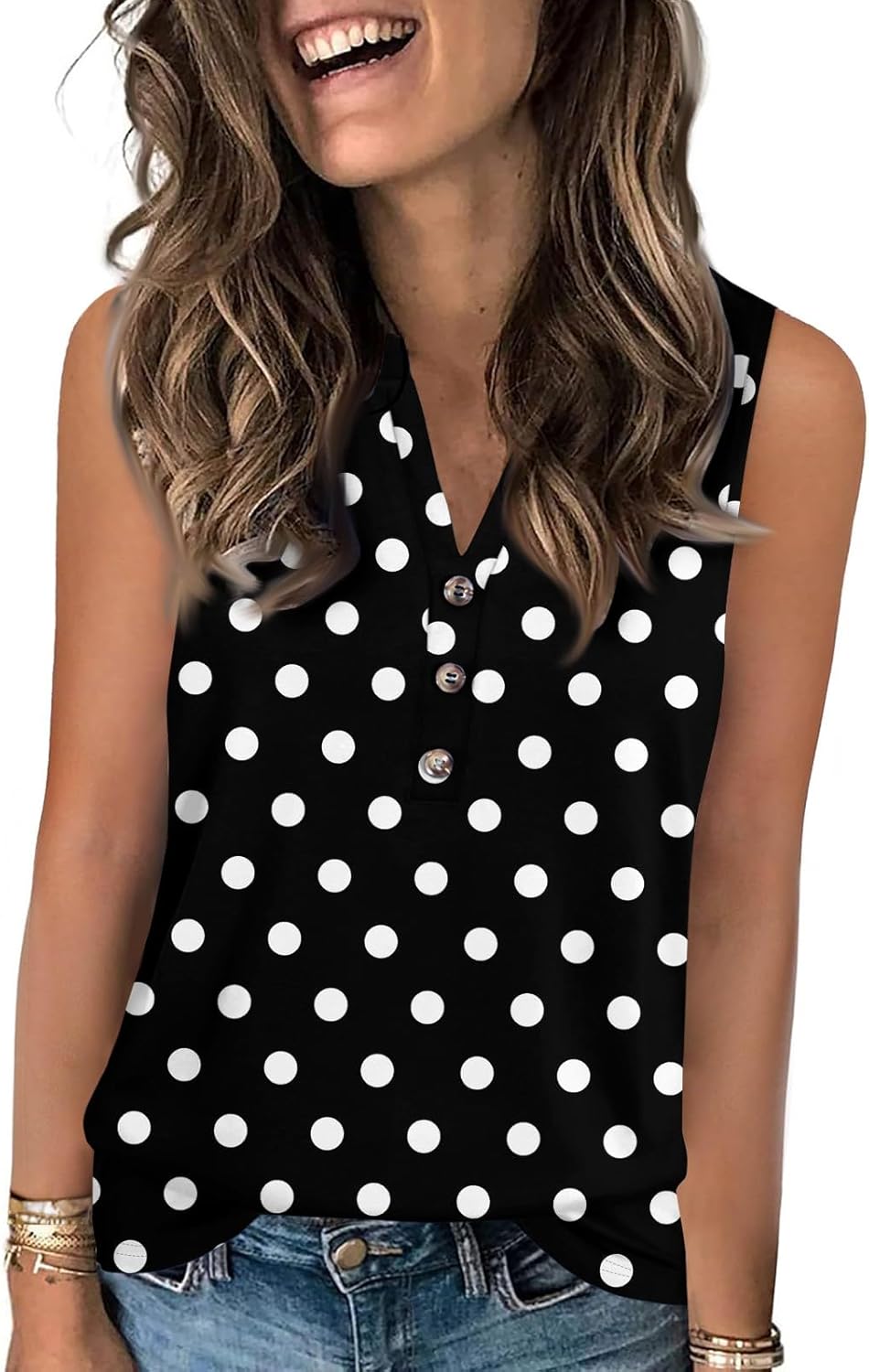 Women’s Sleeveless Casual Tops Button Down Summer Blouse V Neck Shirts Block Stitched Print Trendy Vest Outfits