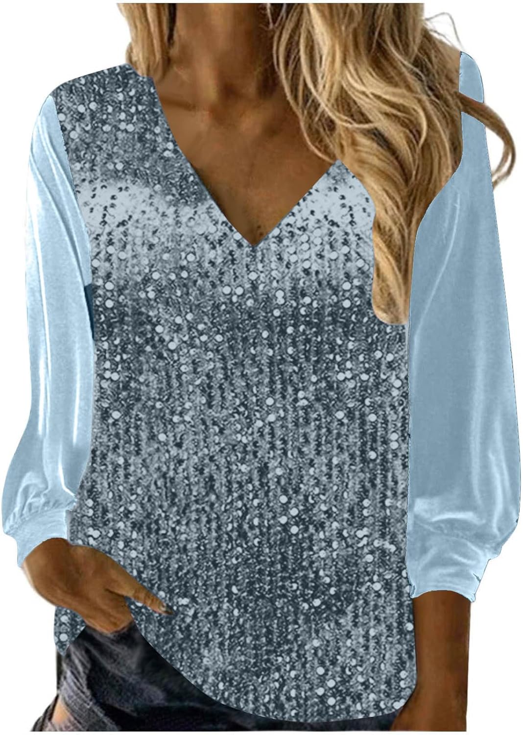 Womens Velvet Sequin Tops V Neck Glitter Sparkly T Shirts Concert Party Long Sleeve Dressy Casual Blouses