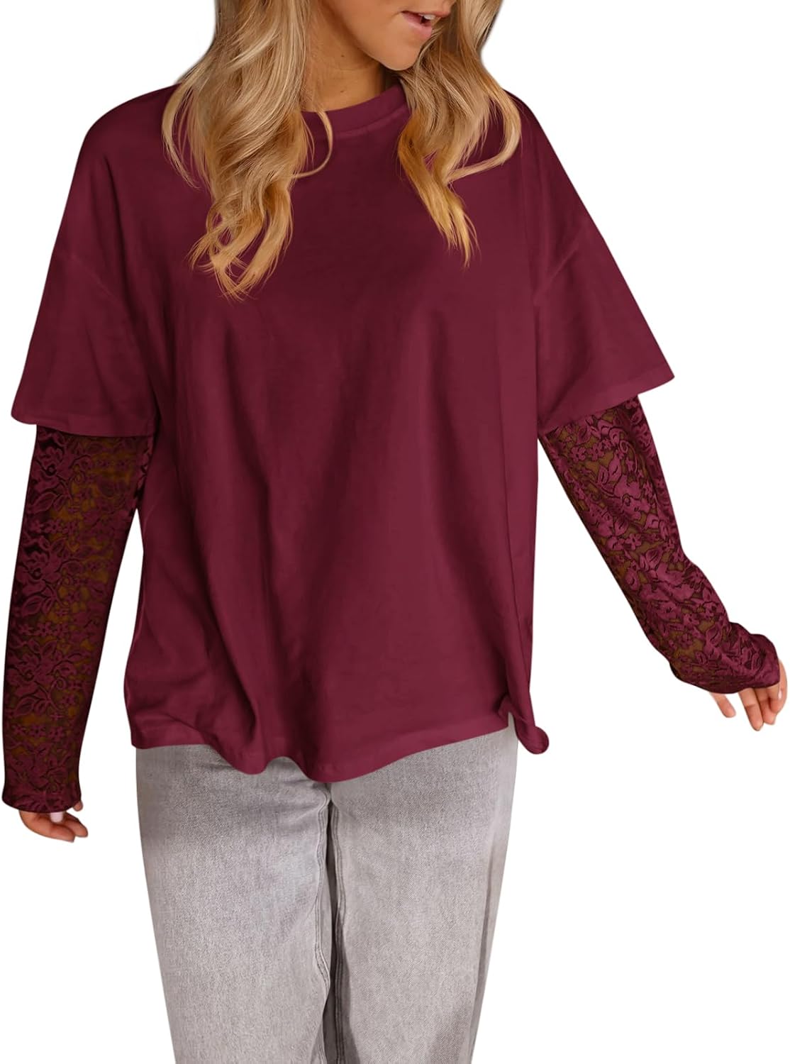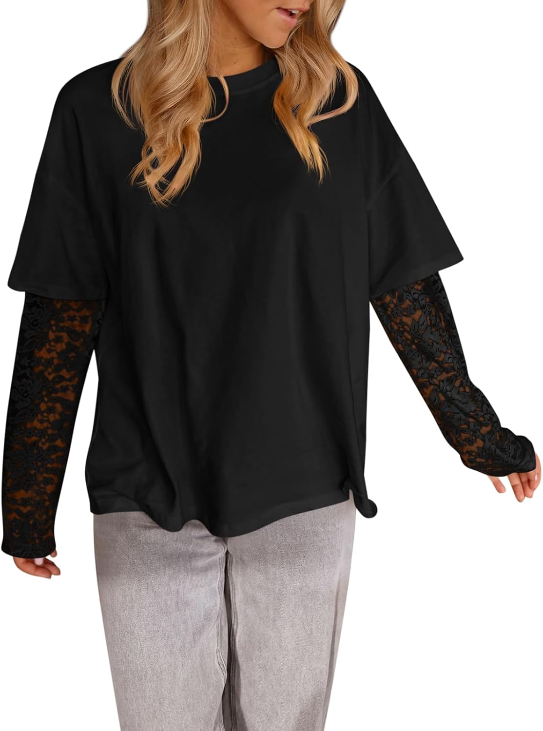 Tankaneo Womens Lace Long Sleeve T Shirts Top Fall 2025 Casual Tops Crewneck Basic Tees Fall Clothes 2025