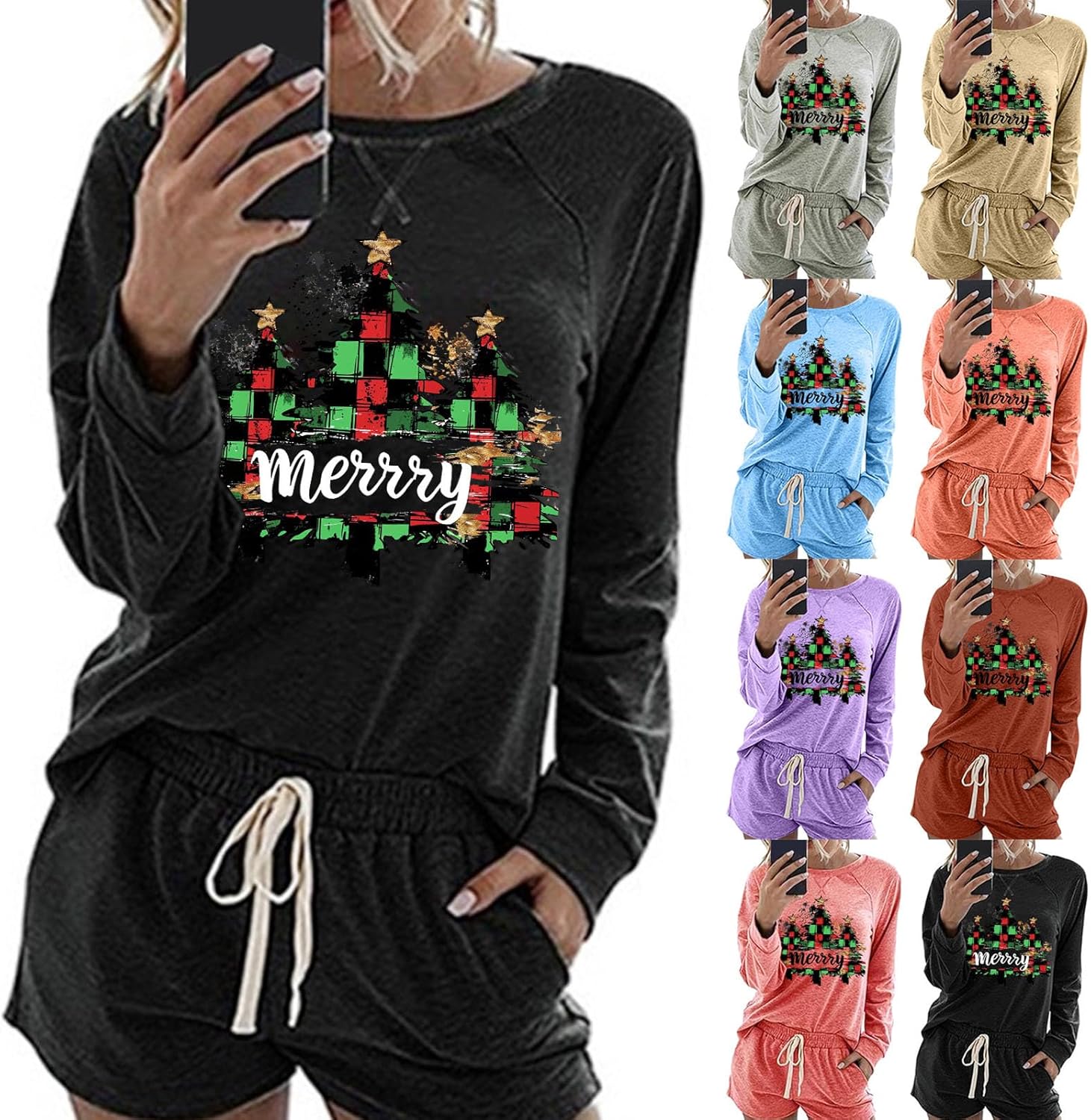 Halloween Pajamas Women Drawstring Baggy Shorts Set Long Sleeve Pumpkin Graphic Crewenck Shirt Comfy Fall Lounge Sets