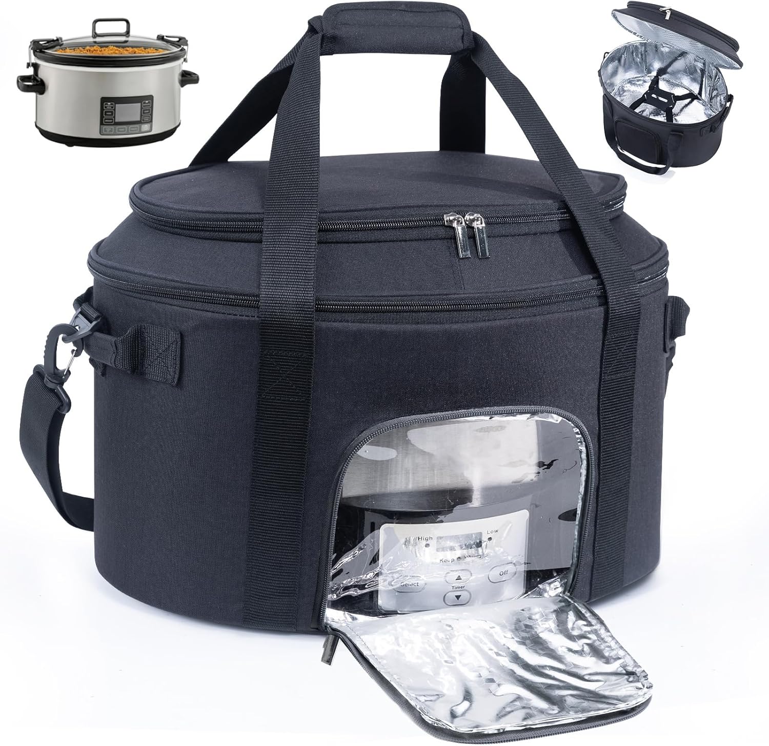 FUN ELEMENTS Double Layer Slow Cooker Carrying Bag for 6-8 Quart Oval CrockPot, Insulated Travel Carrier with Support Pad and Adjustable Straps, Top Zip Compartment and Front Pocket for Utensils,Green